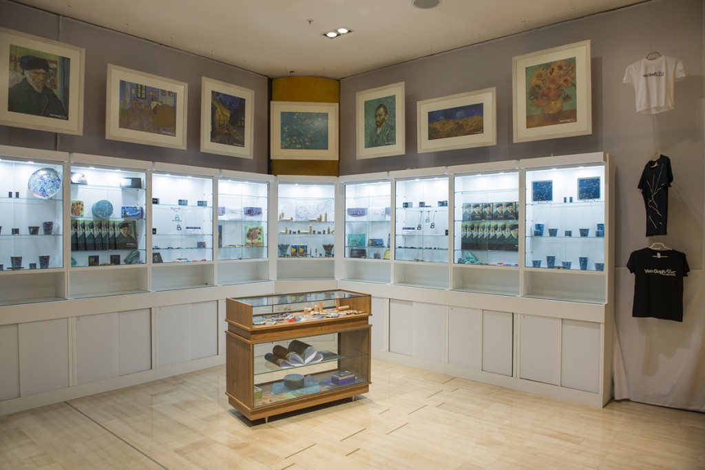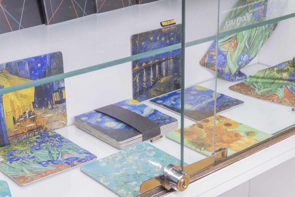 Κούπες και φλυτζάνια σε υπέροχα σχέδια και χρώματα, πιατέλες με τα ομορφότερα σχέδια από τα έργα του ζωγράφου, organizer, μπλοκ σημειώματος, μπλοκ ζωγραφικής, κασετίνες, μπογιές, μπρελόκ, μαγνητάκια για τους μικρούς μας φίλους, μανικετόκουμπα, κοσμήματα, μπλούζες και αφίσες, είναι μερικές επιλογές από τη μεγάλη σειρά προϊόντων Van Gogh Alive – The Experience, που η ΛΑΒΡΥΣ έχει επιμεληθεί με ιδιαίτερη φροντίδα και θα τα βρείτε στο πωλητήριο της έκθεσης.
