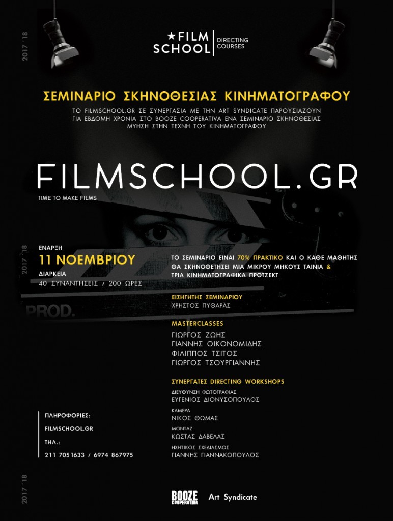 To Filmschool.gr σε συνεργασία με την Art syndicate παρουσιάζουν για έβδομη χρονιά στο Booze cooperativa ένα σεμινάριο Σκηνοθεσίας-μύηση στην τέχνη του Κινηματογράφου.