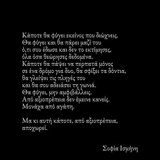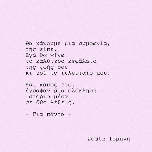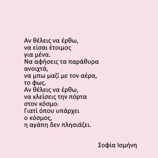 Σοφία: Η αγάπη για τον άνθρωπο, το δίκαιο, τη ζωή που δεν υποτάσσεται στα στερεότυπα που τη θέλουν εγκλωβισμένη στην κοινή γνώμη – η αγάπη για την ίδια την αγάπη. Οτιδήποτε αγγίζει την ψυχή μου είναι λόγος να γίνει ποίημα, τραγούδι, κείμενο, λέξη που δίνει τη δική της μάχη στο χαρτί.