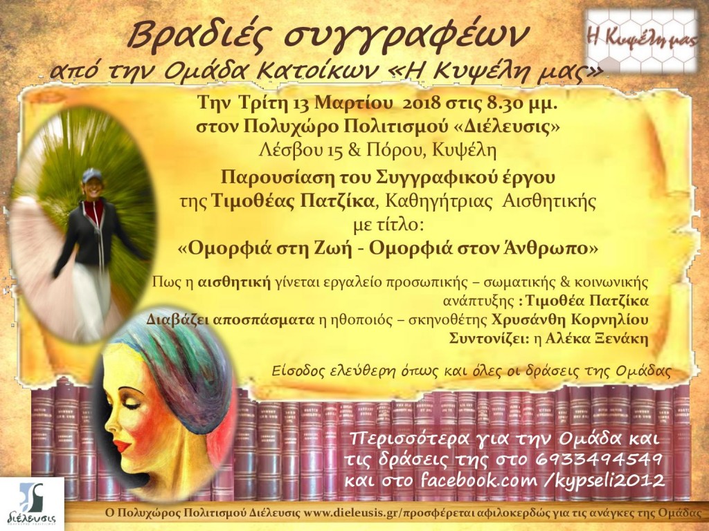 Tην Τρίτη 13 Μαρτίου 2018 στις 8.30 μμ. ετοιμάσαμε για σας, στον Πολυχώρο Πολιτισμού «Διέλευσις» – Λέσβου 15 & Πόρου- Κυψέλη, εκδήλωση με τίτλο: «Ομορφιά στη Ζωή- Ομορφιά στον Άνθρωπο».Βραδιές συγγραφέων από την Ομάδα Κατοίκων «Η Κυψέλη μας»