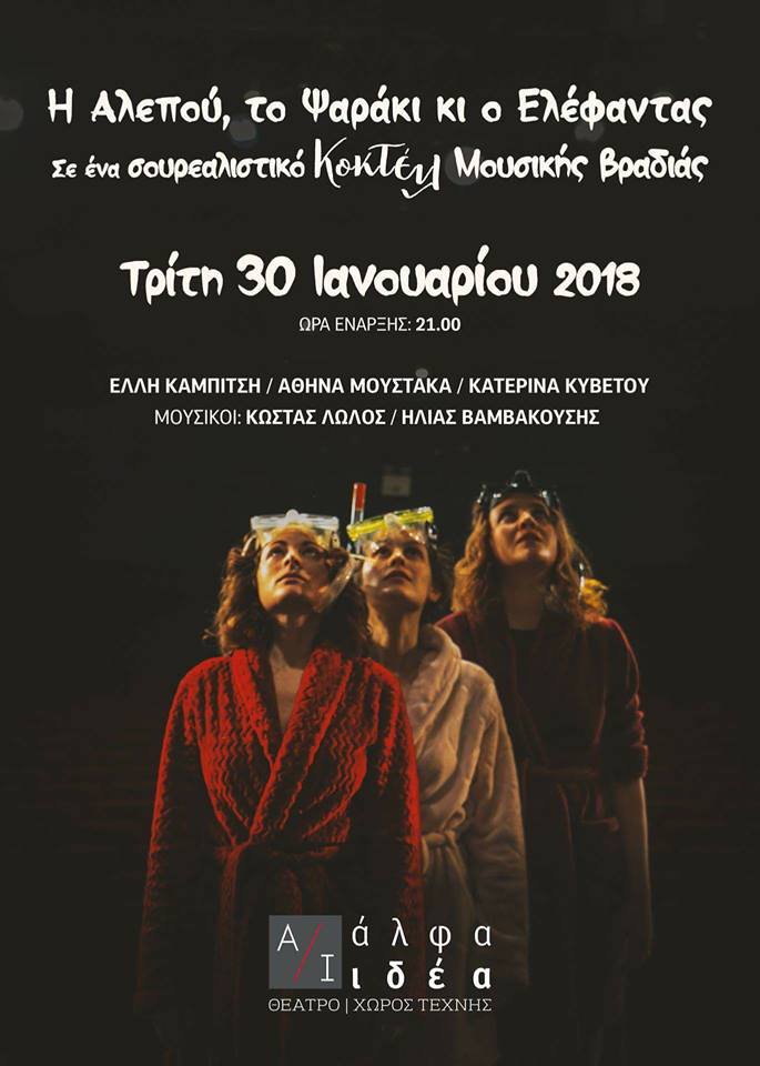 Η Έλλη Καμπίτση, η Αθηνά Μουστάκα και η Κατερίνα Κυβετού παρέα με τους μουσικούς Κώστα Λώλο και Ηλία Βαμβακούση, σας προσκαλούν σε ένα ακόμα ακουστικό Live στο φουαγιέ του θεάτρου Άλφα.Ιδέα.