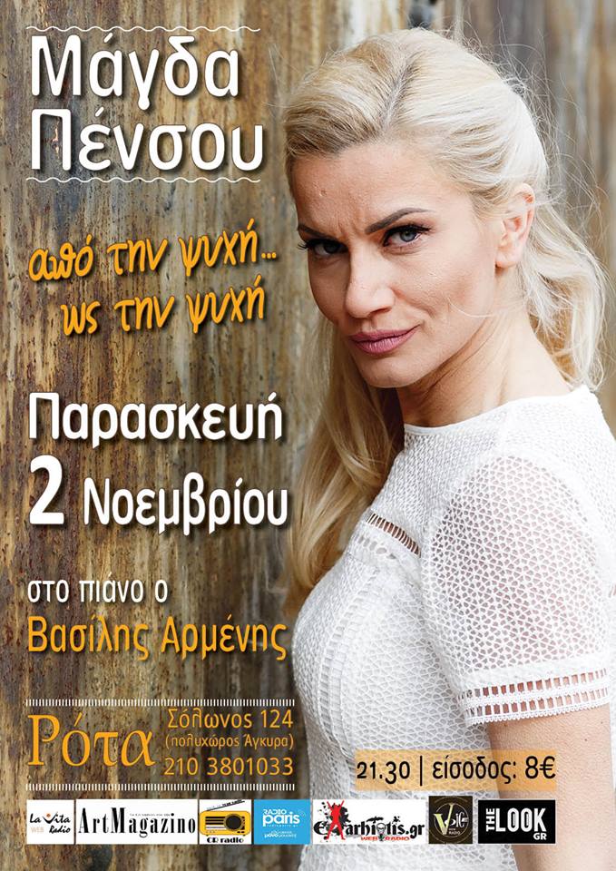 ΗΜάγδα Πένσου, ηθοποιός και τραγουδίστρια συνεχίζει τις επιτυχημένες της μουσικές εμφανίσεις στη «Ρότα», ερμηνεύοντας με τον δικό της ξεχωριστό τρόπο τραγούδια πολλών μεγάλων δημιουργών, όπως Μ. Χατζιδάκι, Μ. Θεοδωράκη, Στ. Ξαρχάκου, Στ. Κραουνάκη, Β. Δημητρίου, Γ. Ανδρέου, Δ. Παπαδημητρίου, Ε. Ρεμπούτσικα κ.α, με αφετηρία την ψυχή της και τερματισμό την ψυχή μας!Μάγδα Πένσου.