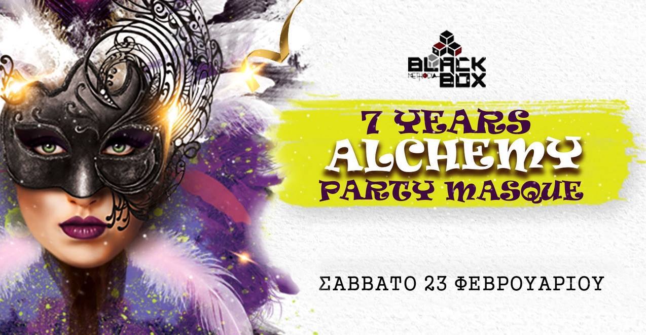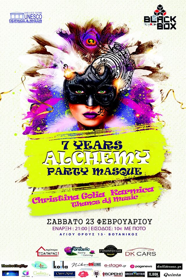 Εφτά χρόνια Αλχημείες… Εφτά χρόνια φαγούρας. Τις γιορτάζουμε καθ’ όπως τους πρέπει. Με σερπαντίνες και κομφετί. Με μάσκες και αποκριάτικες στολές. Με τούρτες και κεράσματα. Με κληρώσεις και πλούσια δώρα. Με τραγούδι και χορό μέχρι πρωίας. Με live από τη Christina Golia και τους Carmica. Με live dj set.