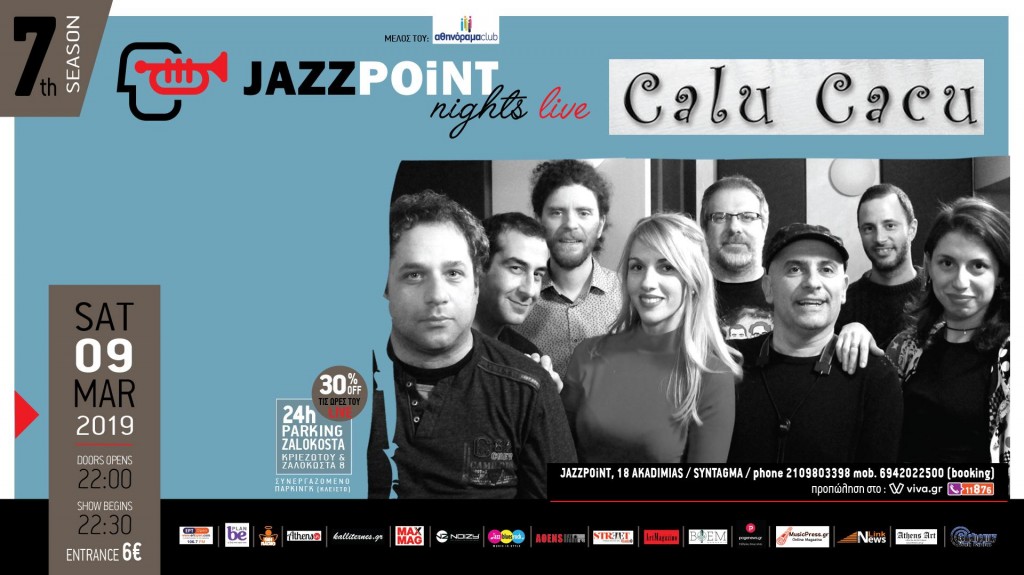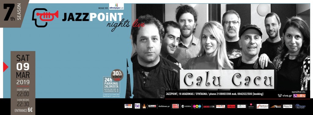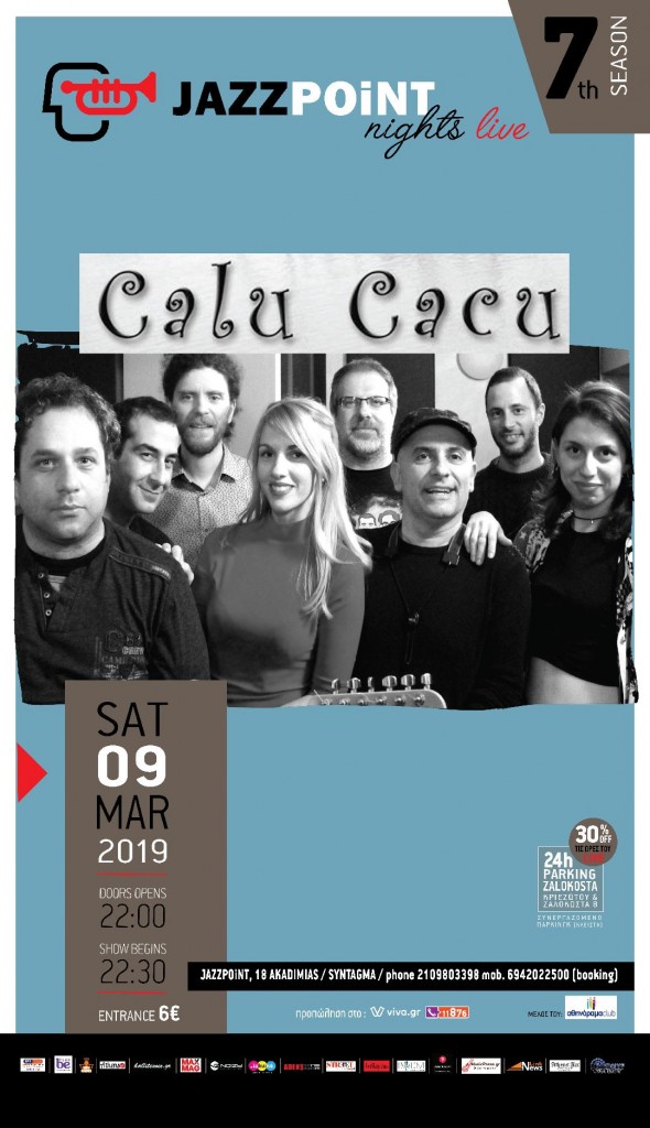 Γνωστοί για το funky-soul-latin κέφι τους, με ξεσηκωτική διάθεση και περίσσιο κέφι, οι «Calu Cacu» έρχονται το τελευταίο αποκριάτικο Σάββατο στο «Jazz Point»! Η γνωστή εννιαμελής μπάντα, ενισχυμένη στις φωνές με την Ελεονόρα από τους Nora’s Cinematic και την Μαριάννα από τους Marianna and the Dizzy Breezes, ετοιμάζει ένα ξέφρενο πάρτι γεμάτο χορό με groovy ρυθμούς και χορευτική μουσική, με έντονη την παρουσία πνευστών και φωνών.