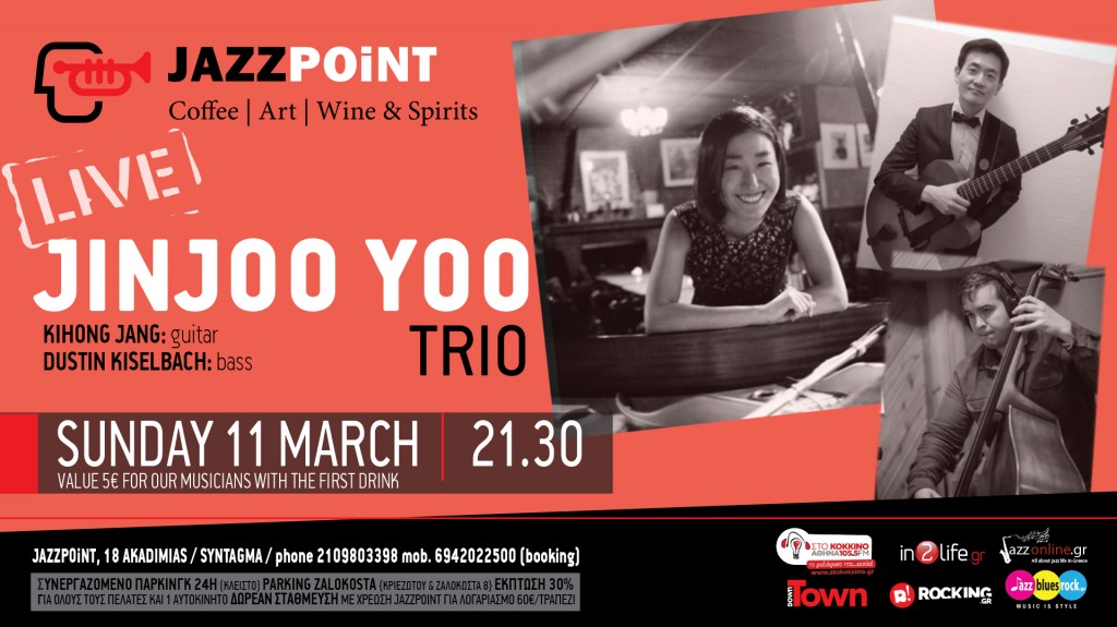 Την Κυριακή 11 Μαρτίου, η σκηνή του «Jazzpoint» υποδέχεται την Κορεάτισσα, διεθνούς φήμης πιανίστρια Jinjoo Yoo! H Jinjoo Yoo έχει καταγωγή από τη Νότια Κορέα, αλλά ζει στη Νέα Υόρκη και έχει καταφέρει να κατακτήσει την μητρόπολη του κόσμου.