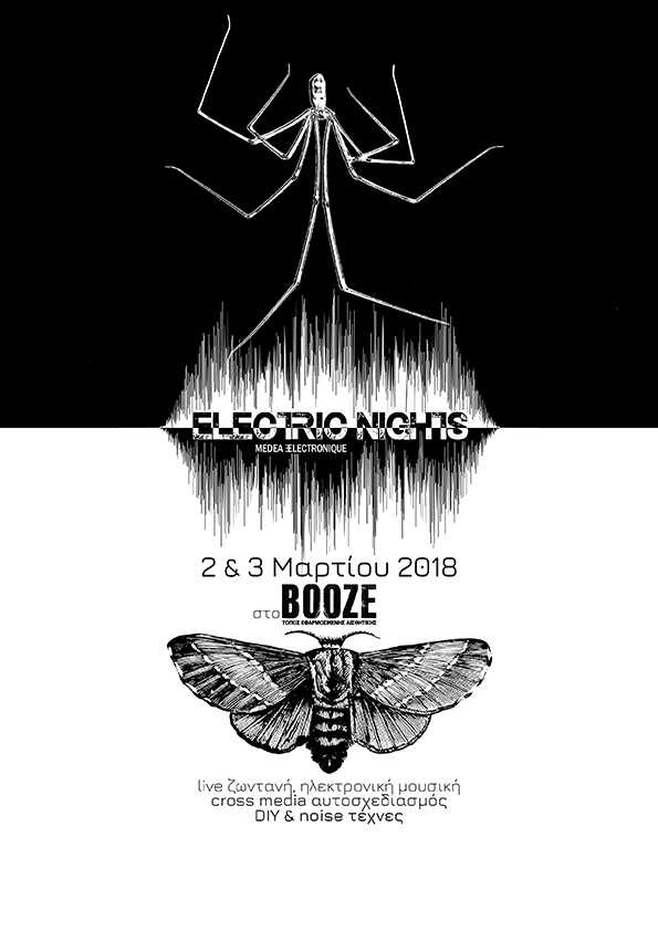 Τo “Electric nights” , το καινοτόμο φεστιβάλ ζωντανής ηλεκτρονικής μουσικής αφιερωμένο στην τέχνη και την τεχνολογία του ήχου, επιστρέφει για 6η χρονιά στην Αθήνα από την καλλιτεχνική ομάδα Medea Electronique. Την Παρασκευή 2 Μαρτίου και το Σάββατο 3 Μαρτίου παρουσιάζονται στη σκηνή του Booze οι νέες δυναμικές παρουσίες και οι πειραματισμοί της ηλεκτρονικής σκηνής από την Ελλάδα και το εξωτερικό.«Electric nights 2018»