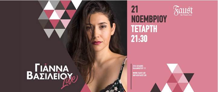 Μετά από δύο πετυχημένες εμφανίσεις της Γιάννας Βασιλείου τον Οκτώβριο στο «Faust», μία ακόμα εμφάνιση έρχεται την Τετάρτη 21 Νοεμβρίου. Στο live αυτό έρχεται με νέα τραγούδια που θα ακουστούν και θα δοκιμαστούν ζωντανά για πρώτη φορά και όπως πάντα, με επιλογές από ελληνικό και ξένο ρεπερτόριο που την έχουν διαμορφώσει.Η Γιάννα Βασιλείου στο «Faust».