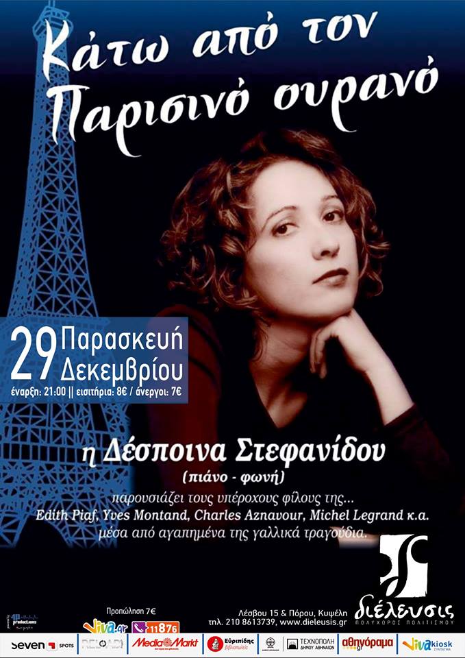 Στον Πολυχώρο Πολιτισμού Διέλευσις η Δέσποινα Στεφανίδου παρουσιάζει τους υπέροχους φίλους της…. Edith Piaf, Yves Montand, Charles Aznavour, Michel Legrand κ.α., μέσα από αγαπημένα γαλλικά τραγούδια, την Παρασκευή 29 Δεκεμβρίου στις 21:00.«Κάτω από τον Παρισινό ουρανό»