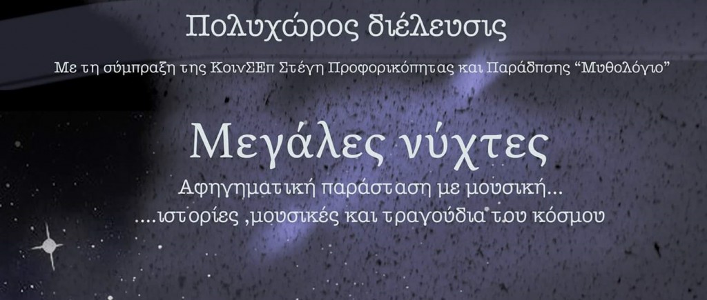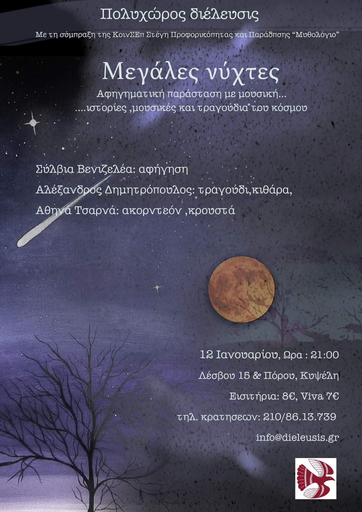 Τις μεγάλες νύχτες του χειμώνα, η φύση κοιμάται και ονειρεύεται. Μέσα στον ύπνο της, ακούει τις πιο γλυκές μελωδίες. Είναι η ώρα της ξεκούρασης και της αναμονής. Είναι η στιγμή που η καρδιά αναζητάει ν’ ακούσει και να ευφρανθεί. Να δει εκείνο το μικρό λαμπερό φως που λάμπει μέσα στο σκοτάδι.Αφηγηματική παράσταση με μουσική και τραγούδια
