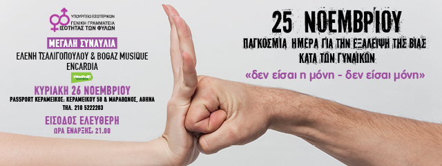 Με αφορμή λοιπόν την Παγκόσμια Ημέρα για την Εξάλειψη της Βίας κατά των Γυναικών, η ΓΓΙΦ διοργανώνει μουσική εκδήλωση την Κυριακή 26 Νοεμβρίου 2017 στο PassPort Κεραμεικός, με τη συμμετοχή της Ελένης Τσαλιγοπούλου, των Bogaz Musique και των Encardia, με στόχο να αναδείξει το φαινόμενο της βίας κατά των γυναικών στη χώρα μας. Το πρόγραμμα θα ανοίξει η Χριστίνα Γεράκη (τραγούδι-κιθάρα), η Καλλιόπη Βασιλείου (τραγούδι-λύρα) και ο Πάνος Γρηγοριάδης (κρουστά).