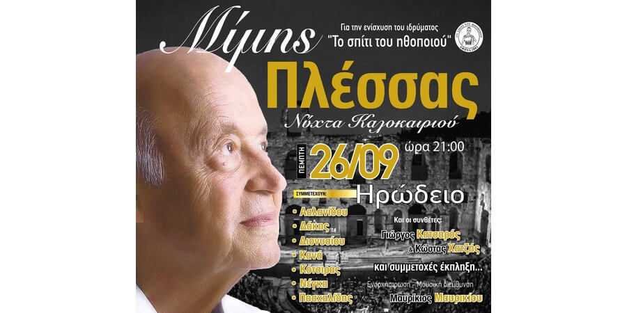Ο Μίμης Πλέσσας σε συνεργασία με το Ίδρυμα Το Σπίτι του Ηθοποιού, μας ετοιμάζει μια Νύχτα Καλοκαιριού, μια βραδιά γιορτής της μουσικής και του θεάτρου, την Πέμπτη 26 Σεπτεμβρίου 2019 και ώρα 21.00, στο Ηρώδειο.Ο Μίμης Πλέσσας σε συνεργασία με το Ίδρυμα Το Σπίτι του Ηθοποιού, μας ετοιμάζει μια Νύχτα Καλοκαιριού, μια βραδιά γιορτής της μουσικής και του θεάτρου, την Πέμπτη 26 Σεπτεμβρίου 2019 και ώρα 21.00, στο Ηρώδειο.