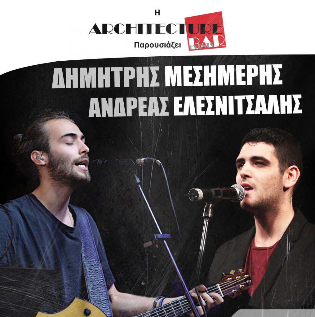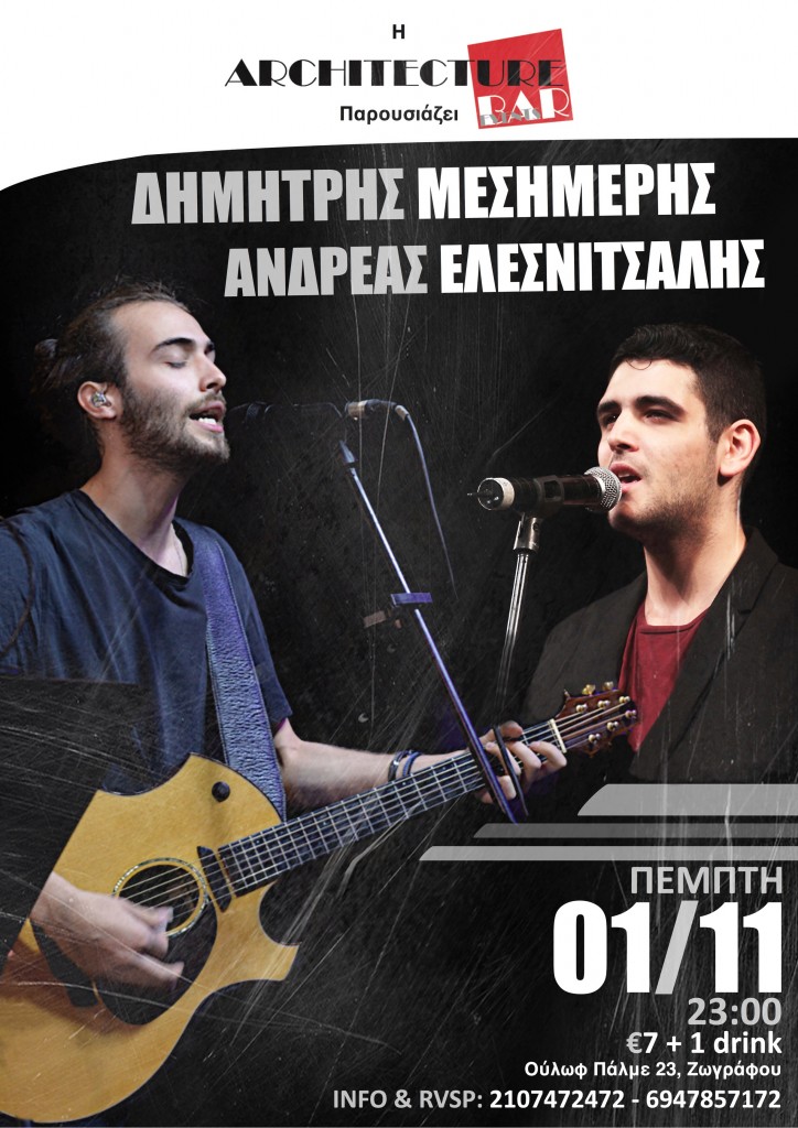 Ο Δημήτρης, μετά από μία πλειάδα εμφανίσεων στην Κύπρο, παίρνει την κιθάρα του στον ώμο και έρχεται στην Αθήνα, όπου θα συναντήσει τον Ανδρέα Ελεσνίτσαλη με το μπουζούκι του για να μας παρουσιάσουν και να ερμηνεύσουν αυτά τα όμορφα τραγούδια. Ραντεβού λοιπόν, την Πέμπτη 1 Νοεμβρίου στον όμορφο χώρο του Architecture Rock Bar στις 23:00 η ώρα.