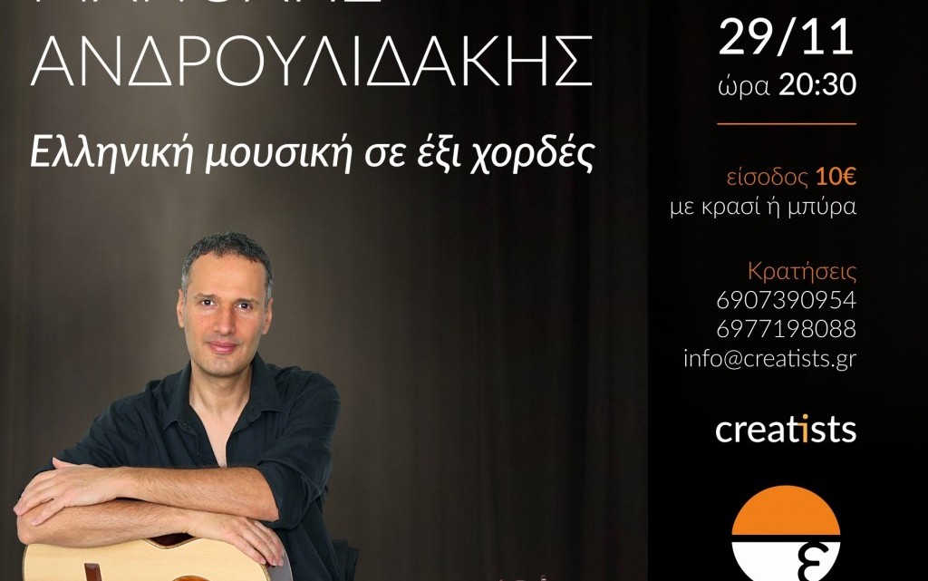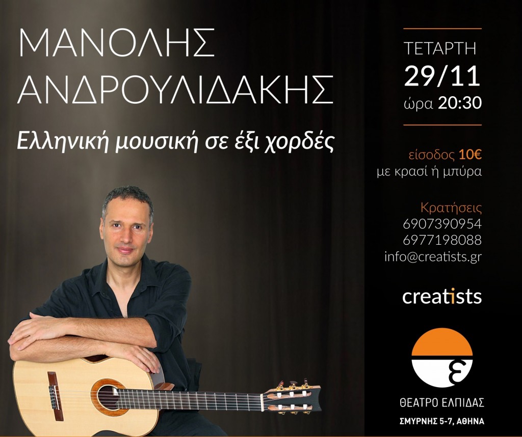 Την Τετάρτη 29 Νοεμβρίου στο «Θέατρο Ελπίδας» και ώρα 20:30 ο συνθέτης Μανόλης Ανδρουλιδάκης, μας ταξιδεύει με την κιθάρα του στις πιο γνωστές και αγαπημένες ελληνικές μελωδίες, κάνοντας ένα ταξίδι στο χρόνο!