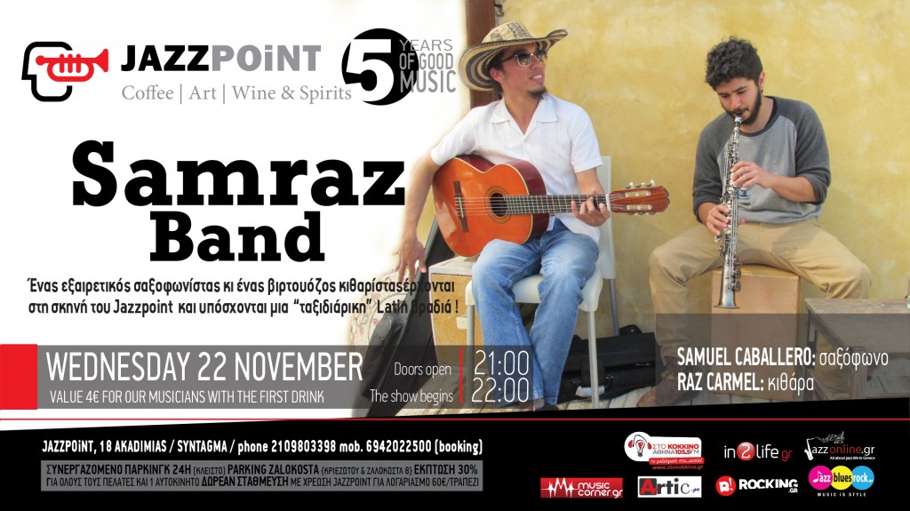 Η Samraz Band αποτελείται από δύο Λατίνους μουσικούς, τον Samuel Caballero από την Κολομβία και τον Raz Carmel από το Ισραήλ με πολλές συναυλίες και περιοδείες στο ενεργητικό τους! Έχουν μοιραστεί την κουλτούρα τους σε όλη τη Μέση Ανατολή, όπως Ιερουσαλήμ, Τελ Αβίβ, Ελάτ, αλλά και Αίγυπτο. Συναντήθηκαν το 2005 και από τότε γυρίζουν όλο τον κόσμο και κλέβουν… την παράσταση!Μια συναρπαστική νύχτα σε Latin μονοπάτια! The SAMRAZ BAND στην Ελλάδα για μία και μοναδική εμφάνιση!