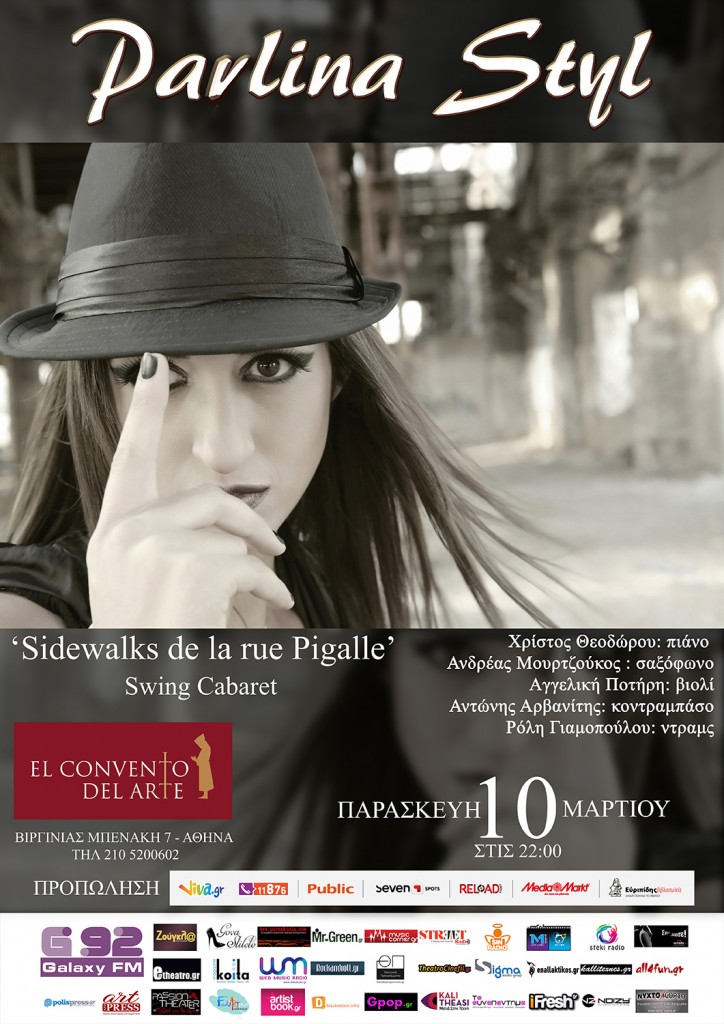 Η περφόρμερ Pavlina Styl με την πενταμελή ορχήστρα της παρουσιάζουν στο EL CONVENTO DEL ARTE τις Παρασκευές 10 και 31 Μαρτίου, την παράσταση «Sidewalks de la rue Pigalle» με νέες διασκευές και πρωτότυπες συνθέσεις σε αγαπημένα κομμάτια του διεθνούς και Ελληνικού ρεπερτορίου.«Sidewalks de la rue Pigalle»