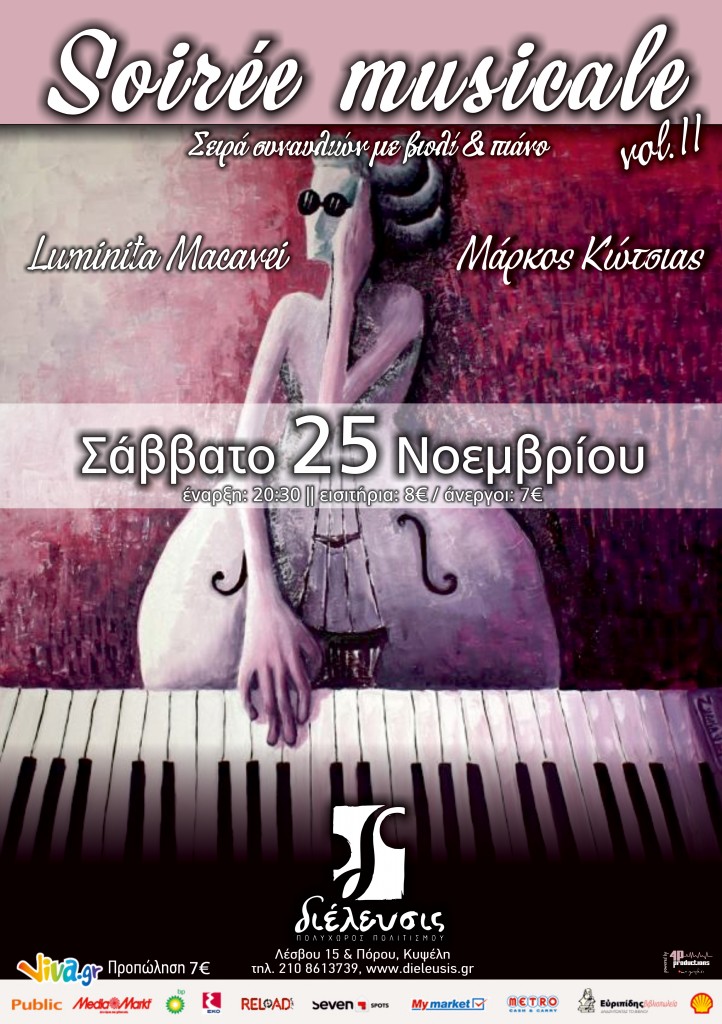 Η βιολίστρια Luminita Macavei και ο πιανίστας Μάρκος Κώτσιας ενώνουν την κοινή τους αγάπη και ενθουσιασμό για την μεγάλη μουσική ανά τους αιώνες και μας παρουσιάζουν, σε μια σειρά συναυλιών, που θα γίνονται κάθε μήνα, μικρά και αγαπημένα κομμάτια, διαφορετικά κάθε φορά. Μας μιλούν για αυτά με σύγχρονο και άμεσο λόγο, τόσο από την οπτική γωνία του συνθέτη όσο και από αυτή του μουσικού εκτελεστή. Μας μιλούν για το πρωταρχικό state of mind του συνθέτη, για την ανόθευτη προσωπική και κοινωνική ατμόσφαιρα μέσα στην οποία γεννήθηκαν αυτά τα έργα, για το τί σημαίνουν για τον μουσικό επί σκηνής. Είναι μια προσπάθεια να καταργηθεί η συγκινησιακή αποστασιοποίηση που προκύπτει με το πέρασμα του χρόνου και, κυρίως, με τη ‘συμμόρφωση’ των βαθύτερων νοημάτων του προσωπικού κόσμου του συνθέτη σε επιφανειακότερες προσεγγίσεις συναυλιακών προγραμμάτων.Soirée musicale με βιολί και πιάνο (Σειρά συναυλιών).