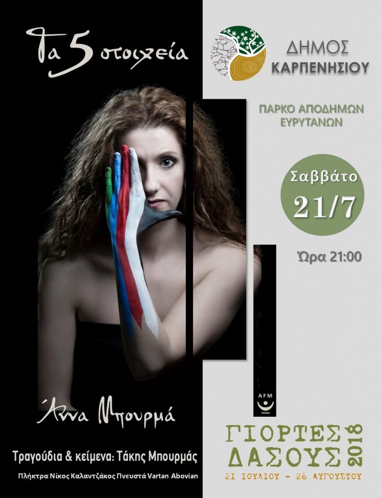 «Τα 5 στοιχεία» της Άννας Μπουρμά θα κάνουν την έναρξη του υπέροχου Φεστιβάλ «Γιορτές Του Δάσους» στο μαγευτικό Καρπενήσι το Σάββατο 21 Ιουλίου.