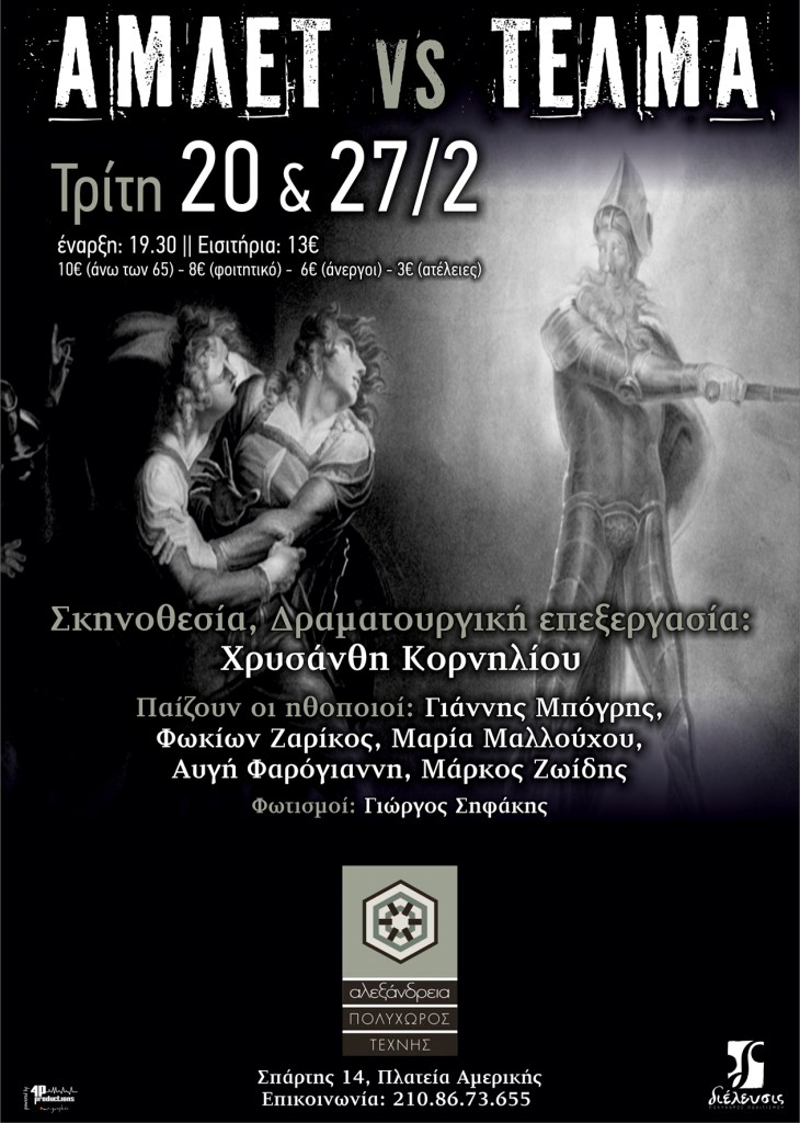 Στο πλαίσιο της αμοιβαίας φιλοξενίας παραστάσεων, ανταλλαγής δράσεων και καλλιτεχνικών αναζητήσεων, θέλοντας να γίνει σαφές ότι οι μικροί και ουσιαστικοί χώροι πολιτισμού δεν ανταγωνιζόμαστε μεταξύ μας αλλά συναγωνιζόμαστε για το κοινό καλό, την διεύρυνση και αναβάθμιση της πολιτισμικής στάθμης στις περιοχές που δρούμε, ο πολυχώρος τέχνης «Αλεξάνδρεια» πρόκειται να φιλοξενήσει την παράσταση «Άμλετ vs Τέλμα», μια παραγωγή του πολυχώρου πολιτισμού «Διέλευσις».«Άμλετ vs Τέλμα»
