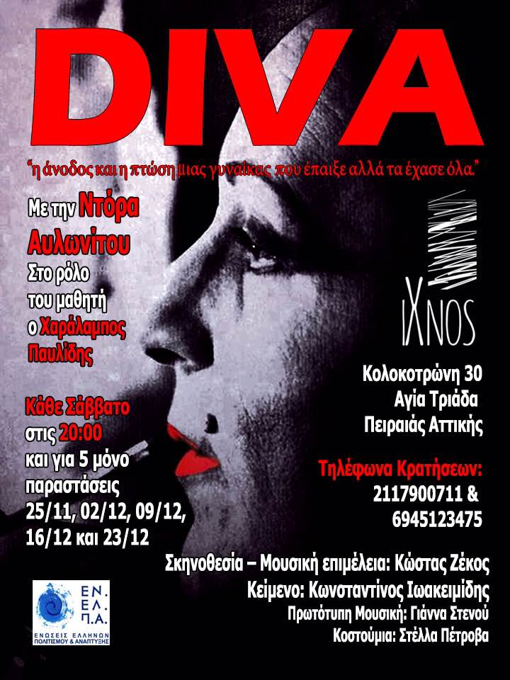 Μετά την μεγάλη επιτυχία που γνώρισε πριν 2 χρόνια η παράσταση “DIVA” σε σκηνοθεσία Κώστα Ζέκου, ανεβαίνει πάλι πλήρως ανανεωμένη, στο ΙΧΝΟΣ στον Πειραιά.“DIVA” του Κωνσταντίνου Ιωακειμίδη
