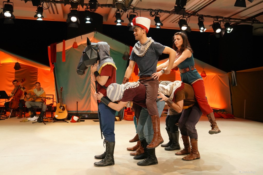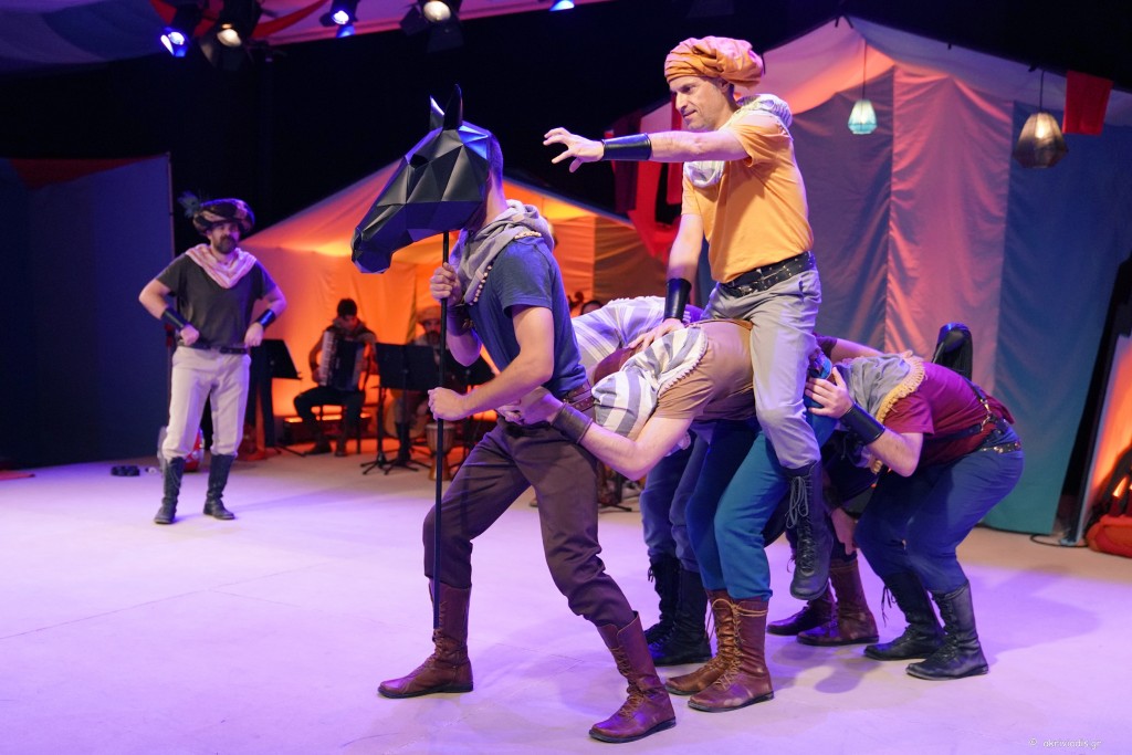 «Το Φτερωτό Άλογο» ζωντανεύει και ένα ανατολίτικο σαράι στήνεται κυριολεκτικά επί σκηνής, καλώντας τα παιδιά να μπουν στον καζαντζακικό κόσμο. Με την είσοδό τους στον βασιλικό περίβολο, όχι σαν απλοί θεατές, αλλά σαν καλεσμένοι της βασιλικής Αυλής, παρακολουθούν το παραμύθι καθισμένα σε αναπαυτικά μαξιλάρια και βιώνουν τα γεγονότα με όλες τους τις αισθήσεις. Οι ηθοποιοί ξετυλίγουν το νήμα της ιστορίας, ντύνοντας την με τραγούδια και εκτελώντας με τα μουσικά τους όργανα ζωντανά τις πρωτότυπες μουσικές συνθέσεις του Νίκου Κυπουργού.