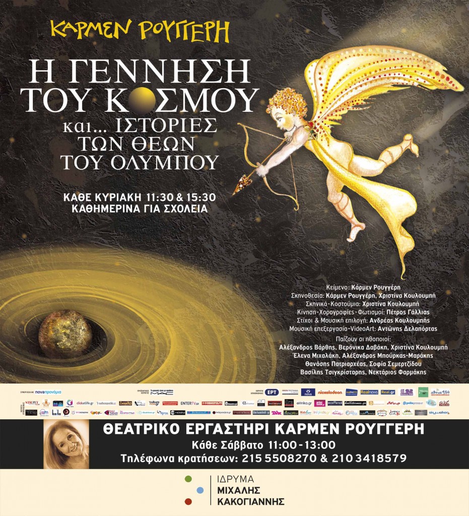 Η Κάρμεν Ρουγγέρη έδωσε και πάλι φέτος τον λόγο στα παιδιά, ώστε να διαλέξουν τα ίδια την παράσταση που θέλουν να δούν. Ετσι στο Ίδρυμα Μιχάλης Κακογιάννης, όπου συνήθως ανεβάζει έργα εμπνευσμένα απο την Ελληνική μυθολογία, θα παρουσιάσει ένα έργο που περιέχει την γέννηση του κόσμου και ιστορίες γνωστές και άγνωστες των Θεών του Ολύμπου. Ιστορίες που έπλασαν ο αρχαίος ελληνικός λαός και οι ποιητές του.