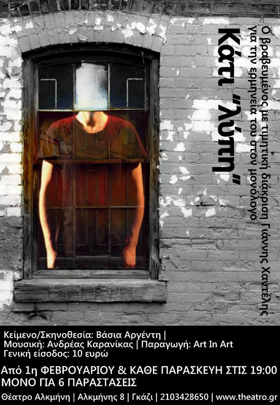 Οβραβευμένος με τιμητική διάκριση Γιάννης Χαντέλης για την ερμηνεία του στον μονόλογο «Κάτι λύπη» της Βάσιας Αργέντη, έρχεται για 6 μόνο παραστάσεις στο θέατρο «Αλκμήνη» κάθε Παρασκευή από 1 Φεβρουαρίου στις 19:00.