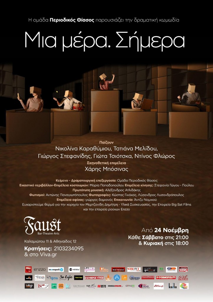 Πέντε παράλληλες ιστορίες ξετυλίγονται με φόντο ένα πολύβουο αστικό τοπίο. Πέντε άνθρωποι, εγκλωβισμένοι στη συνήθειά τους, νιώθουν ασφάλεια μέσα στους χάρτινους τοίχους της φυλακής που αποκαλούν σπίτι τους. Η καθημερινότητα τους καθηλώνει και μοιάζουν αστείοι, σχεδόν ξεκαρδιστικοί, γιατί πιστεύουμε ότι αυτοί είναι οι «άλλοι».Η ομάδα «Περιοδικός Θίασος» παρουσιάζει την δραματική κωμωδία «Μια μέρα. Σήμερα».