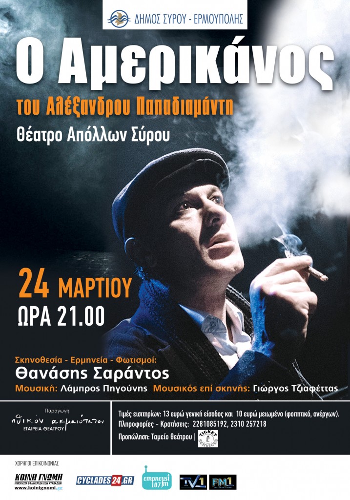«…Αφού όργωσε την Ελλάδα με αριστουργηματικό διήγημα του Αλέξανδρου Παπαδιαμάντη “Ο Αμερικάνος”, ο καλός ηθοποιός και σκηνοθέτης Θανάσης Σαράντος επιστρέφει στην Αθήνα …»