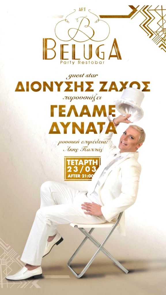 Στην παράστασή του «Γελάμε Δυνατά» που φιλοξενείται στον εκπληκτικό χώρο του Beluga Art στον Πειραιά, εδώ και ήδη δύο μήνες, θα παρακολουθήσουμε τον Διονύση Ζάχο ως Αλίκη Βουγιουκλάκη, Ρένα Βλαχοπούλου, Ζωζώ Σαπουντζάκη, Μελίνα Μερκούρη, Σάκη Ρουβά, Light, αλλά και σε πρόσωπα της επικαιρότητας όπως, Μητσοτάκης, Κατσαφάδου, Πρίνου κ.α. Επίσης, με τον δικό του μοναδικό τρόπο, αναβιώνουμε την δημοφιλή σειρά του ΑΝΤ1 «Εγκλήματα», όπου ο Διονύσης στον ρόλο της Κορίνας, που υποδύονταν η Μαρία Καβογιάννη «δίνει πόνο»…