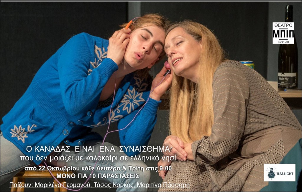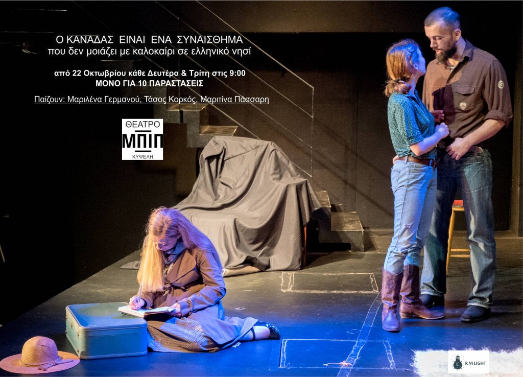 Ηεπιτυχημένη παράσταση «Ο Καναδάς είναι ένα συναίσθημα που δεν μοιάζει με καλοκαίρι σε ελληνικό νησί» επιστρέφει στο θέατρο ΜΠΙΠ της Κυψέλης στις 22 Οκτωβρίου, μόνο για δέκα παραστάσεις, Δευτέρα και Τρίτη στις 9:00μμ.