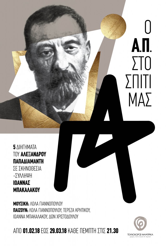 Μία θεατρική παράσταση που επιχειρεί να ανατρέψει την για πολλούς λανθασμένη εικόνα ενός θρησκόληπτου ηθικολόγου συγγραφέα και να αναδείξει “τον κοινωνικό Παπαδιαμάντη, αυτόν που στηλιτεύει την αδικία, τους πολιτικάντηδες, την παραδοσιακή θέση της γυναίκας που την «πουλάνε» μέσω του γάμου. Τον χιουμορίστα Παπαδιαμάντη, με την ειρωνεία και τον σαρκασμό για να υποβάλλει σε οξύτατη κριτική πολλές καταστάσεις της εποχής. Τον ερωτικό Παπαδιαμάντη, με τις ποιητικές, αισθησιακές εικόνες των αβάσταχτων ερώτων. Τον ποιητή Παπαδιαμάντη, με τη μαγεία των λέξεων και των φράσεων που χρησιμοποιεί.” – (Μπασκόζος Γιάννης Ν., Το Βήμα, 03/01/2011)«Ο Α.Π. στο σπίτι μας»