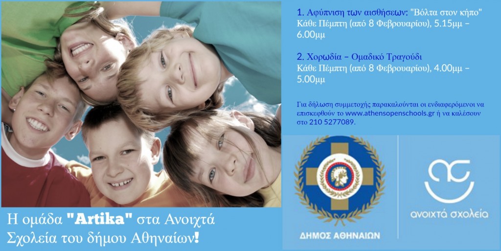 Ηομάδα Artika ανακοινώνει την έναρξη συνεργασίας με το πρόγραμμα «Ανοιχτά Σχολεία» του δήμου Αθηναίων με δύο πρωτότυπες δράσεις για βρέφη και παιδιά.Η Artika στα «Ανοιχτά Σχολεία» του δήμου Αθηναίων!