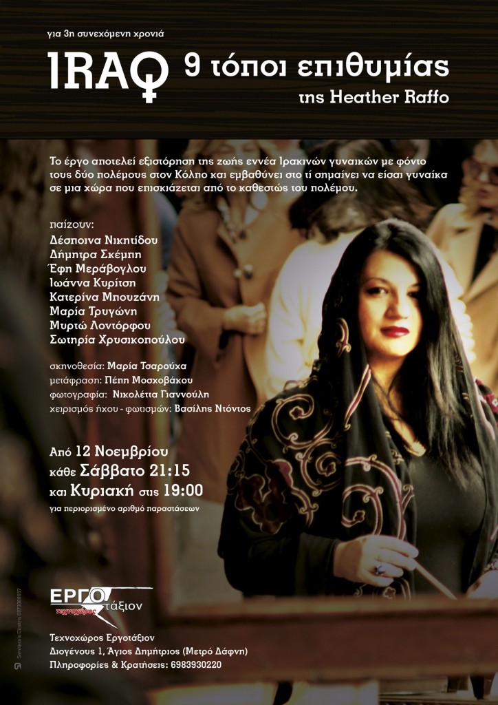 Tο έργο αποτελεί εξιστόρηση της ζωής εννέα Ιρακινών γυναικών, με φόντο τους δύο πολέμους στον Κόλπο και εμβαθύνει στο τί σημαίνει να είσαι γυναίκα, σε μια χώρα που επισκιάζεται από το καθεστώς του πολέμου.Η παράσταση «Ιraq- 9 τόποι επιθυμίας» συνεχίζει τις παραστάσεις λόγω επιτυχίας μόνο Κυριακές στις 19:00.