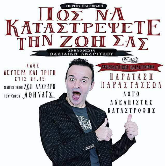 Το «Πώς να καταστρέψετε τη ζωή σας» είναι η νέα αφοπλιστικά αληθινή κωμωδία του Γιώργου Ηλιοπούλου που ανεβαίνει σε σκηνοθεσία Βασιλικής Ανδρίτσου και είναι τόσο αληθινή που ο καθένας εύκολα θα αναγνωρίσει κομμάτια του εαυτού του. Η παράσταση έχει πολλές κινηματογραφικές αναφορές και είναι ντυμένη με μουσικές από ταινίες .