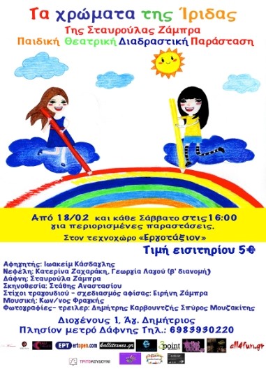 Η Νεφέλη και η Δάφνη είναι αχώριστες από τα πρώτα παιδικά τους βλέματα, ώσπου μεγάλωσαν και ανακάλυψαν ένα καινούριο παιχνίδι “Εγώ έχω περισσότερα 1-0“. Μετά από μια δυνατή μπόρα ένα ουράνιο τόξο, κάλυψε από άκρη σε άκρη τον ουρανό. Τα κορίτσια για άλλη μια φορά βρέθηκαν αντιμέτωμα να παλέψουν για την κατάκτηση του. Η Δάφνη άρπαξε το κίτρινο του φεγγαριού και έγινε βασίλισσα του ουρανού και των αστεριών. Η Νεφέλη άρπαξε το μπλε και βρέθηκε βασίλισσα της θάλασσας. Κανένα συναίσθημα μοιράσματος δε περιόρισε την ευτυχία τους, για λίγο….“Τα χρώματα της Ίριδας” της Σταυρούλας Ζάμπρα στον Τεχνοχώρο “Εργοτάξιον”