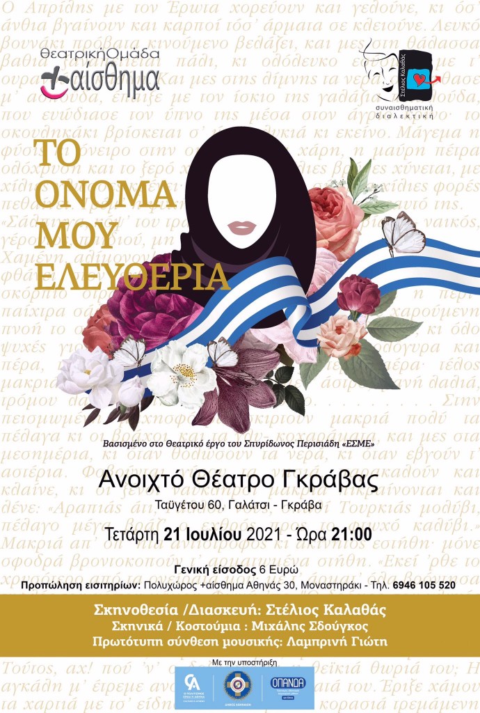 Η Θεατρική ομάδα +αίσθημα της Συναισθηματικής Διαλεκτικής με αφορμή την επέτειο των 200 χρόνων από την Ελληνική Επανάσταση, παρουσιάζειτην θεατρική παράσταση «Το όνομά μου Ελευθερία», που βασίζεται στο δραματικό ειδύλλιο του Σπυρίδωνος Περεσιάδη , «Εσμέ», σε διασκευή του ηθοποιού και σκηνοθέτη Στέλιου Καλαθά, τηνΤετάρτη 21 Ιουλίου και ώρα 21.00, στο Ανοιχτό Θέατρο Γκράβας με την υποστήριξη του ΟΠΑΝΔΑ στο πλαίσιο του προγράμματος «Ο Δήμος Αθηναίων στηρίζει τον πολιτισμό».Θεατρική παράσταση ομάδας +αίσθημα με τίτλο