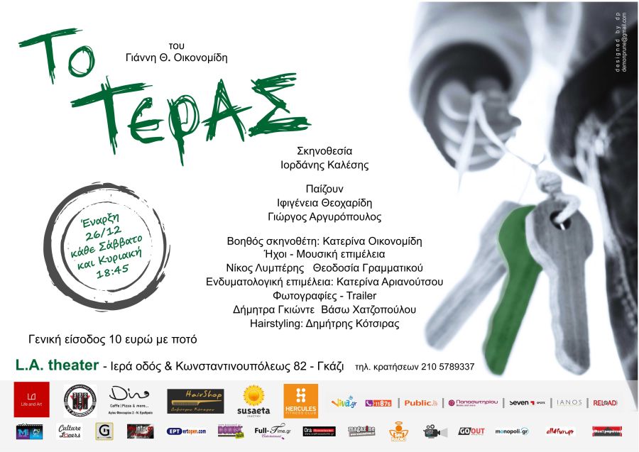 Το Τέρας, του Γιάννη Θ. Οικονομίδη, ανεβαίνει για πρώτη φορά στο lobby του Life n’ Art Theater και θέτει καίρια ερωτήματα για τις ανθρώπινες σχέσεις και τον τρόπο, με τον οποίο αυτές διαμορφώνονται, εκούσια ή ακούσια στην καθημερινότητα. Πρόκειται για μια εύστοχη και άκρως ρεαλιστική ανατομία της ελληνικής οικογένειας. Με διεισδυτική κριτική ματιά, σαρκαστική διάθεση, αλλά και στιγμές έντονης συγκίνησης, ξεπροβάλλουν ανάγλυφα στο φως της θεατρικής σκηνής, χαρακτηριστικές πτυχές της πολύπλευρης κρίσης, που μαστίζει τη σύγχρονη ελληνική κοινωνία. Πώς φτάσαμε σε αυτό το καθεστώς αλλοτρίωσης;… Με μαεστρία και καυστικό ρεαλισμό, «Το τέρας» επιχειρεί να δώσει τη δική του απάντηση και διεκδικεί το ενδιαφέρον και την προσοχή όλων μας.Παίζουν οι ηθοποιοί